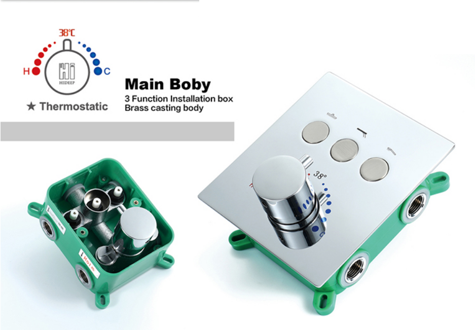 Robinet mitigeur thermostatique à encastrer, système push. Équipé de 3 sorties, il permet de régler la température et d'alimenter à la fois le ciel de pluie et la douchette à main. Corps d'encastrement inclus. Dimensions : 170 x 150 mm