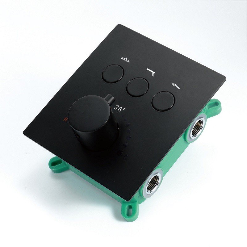 Avec sa cartouche thermostatique et son système push à 3 voies, ce robinet mural permet de gérer facilement la température de l'eau. Un système à poussoir est utilisé pour le choix des modes, ce qui permet de l'adapter à de nombreuses compositions de douche ciel de pluie mural ou encastré au plafond.