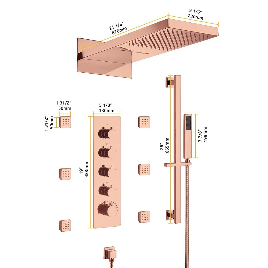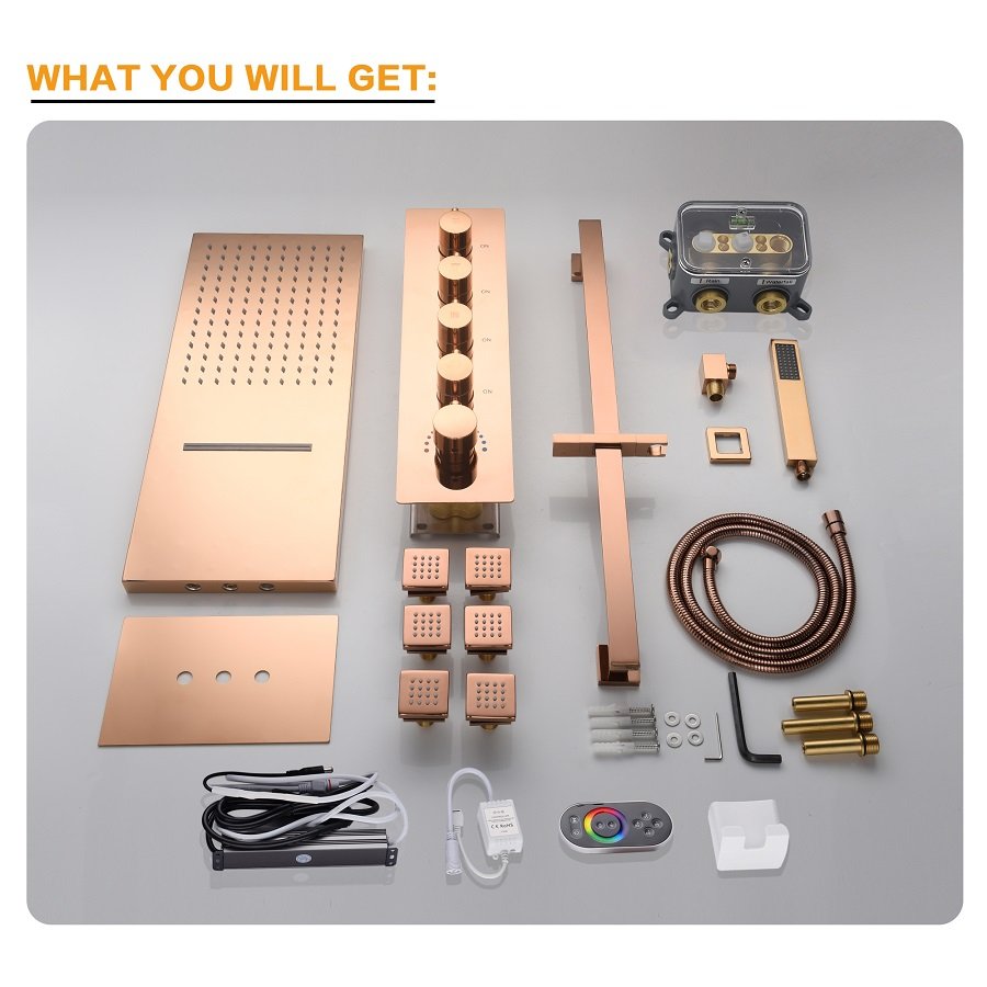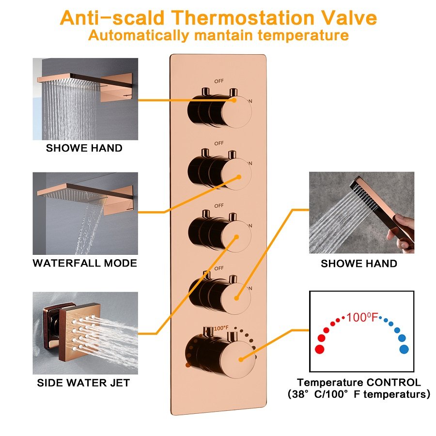Robinet mitigeur thermostatique à encastrer. Équipé de 4 sorties, il permet de régler la température et d'alimenter à la fois le ciel de pluie et la douchette à main. Corps d'encastrement inclus. Ce type de robinetterie dispose d'une butée de sécurité à 38°C afin d'éviter les brûlures. Dimensions : 483 x 130 mm