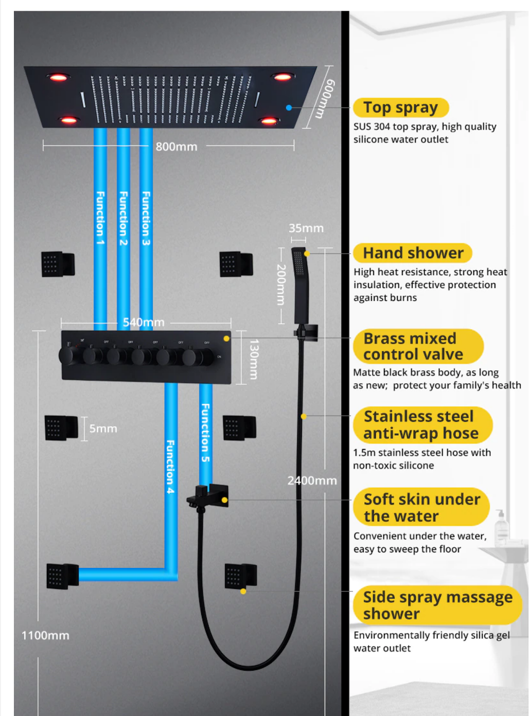 Le panneau de douche est équipé d'un éclairage LED avec fonction Chromothérapie. Une technique dont l’objectif est de stimuler les sensations afin de rétablir les déséquilibres générés par le stress quotidien et/ou favoriser des états d’esprit plus positifs. Les couleurs ravivent notre bien-être et sont l’apanage de plusieurs spécialités de médecines alternatives et traditionnelles.
