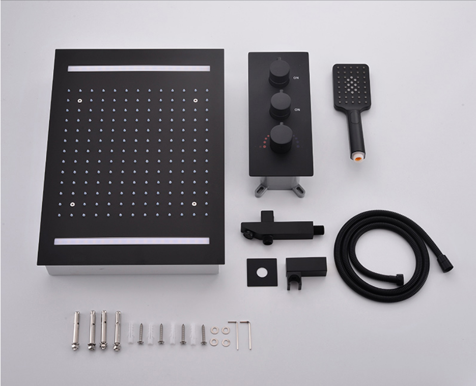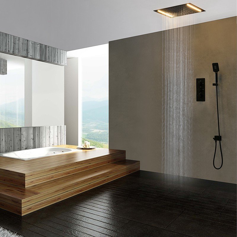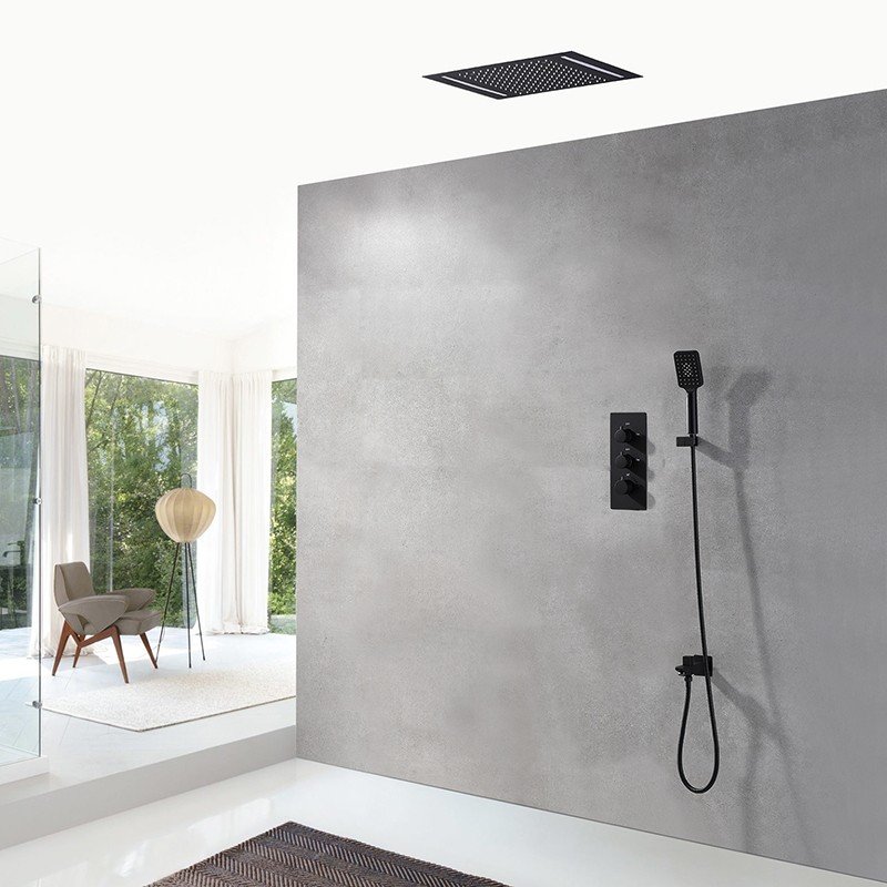 Le ciel de pluie Tork se démarque par ses deux lumières LED positionnées sur chaque largeur du panneau. Sa finition noire mate lui confère un style sobre, élégant et facile à intégrer dans tout type de salle de bain contemporaine. En version encastrable au plafond, ce modèle permet également un véritable gain de place tout en renforçant l’esthétique globale de l’espace douche.