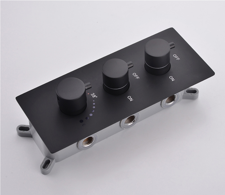 Robinet mitigeur thermostatique à encastrer. Équipé de 3 sorties, il permet de régler la température et d'alimenter à la fois le ciel de pluie et la douchette à main. Corps d'encastrement inclus. Dimensions : 303 x 130 mm