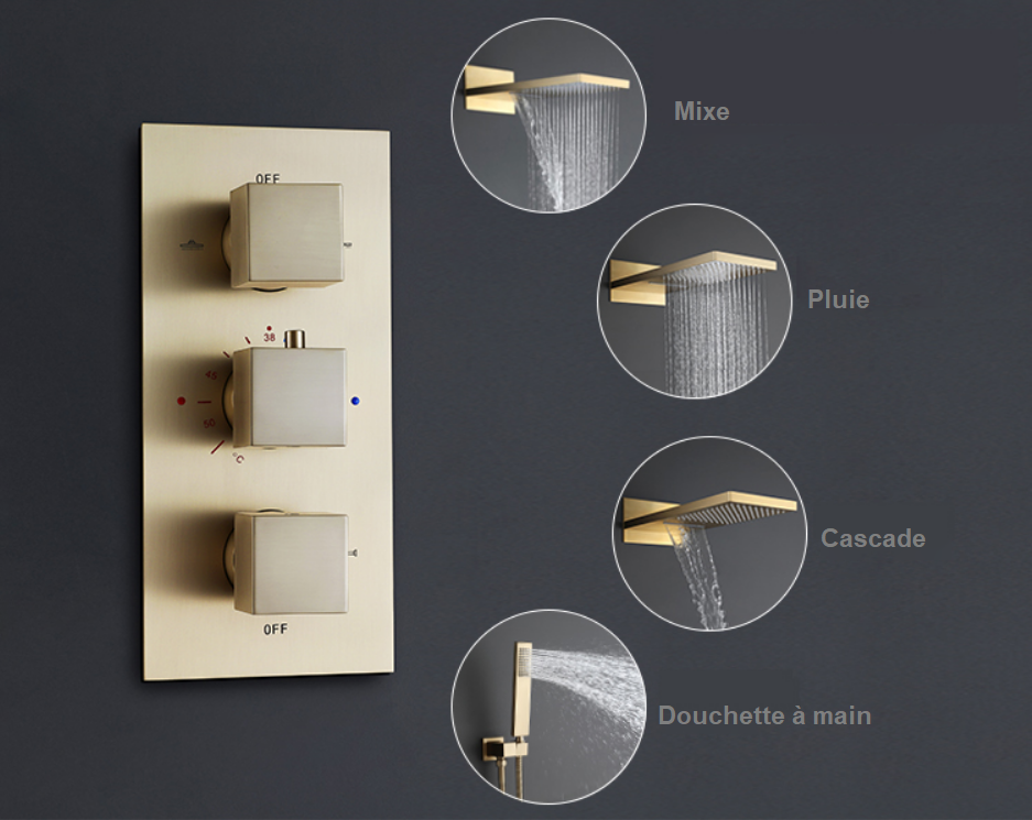 Le design doré est un marqueur fort de raffinement dans l’univers de la salle de bain contemporaine. Avec sa finition dorée soignée, la douche pluie Xirok s’intègre naturellement dans un espace élégant et moderne, tout en offrant une expérience de douche confortable et maîtrisée.