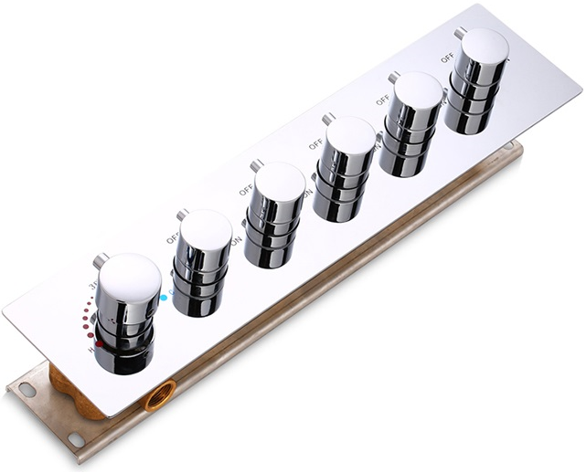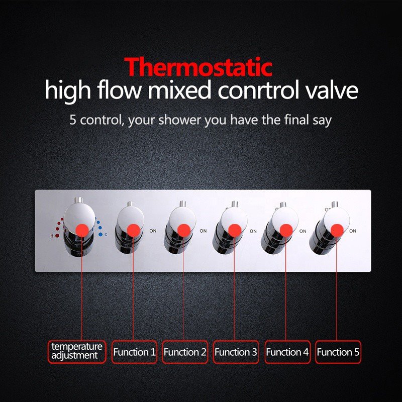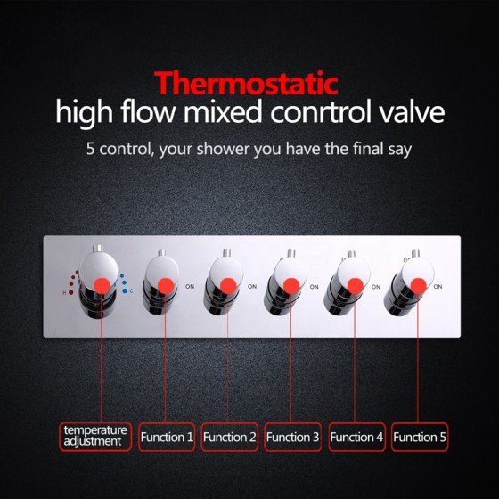 Le robinet de composition de douche thermostatique 5+1 est un bon choix pour une composition ciel de pluie multi fonctions. La finition chromée et la qualité laiton en font un accessoire de salle de bain parfait.