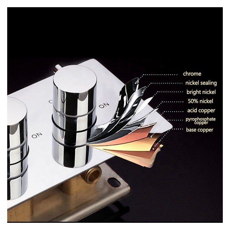 Le robinet mélangeur thermostatique pour composition de douche ciel de pluie en laiton massif combine un contrôle total de la température avec une montée instantanée de la température de l'eau.